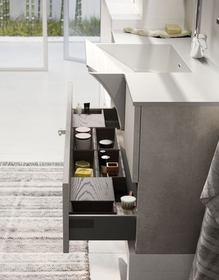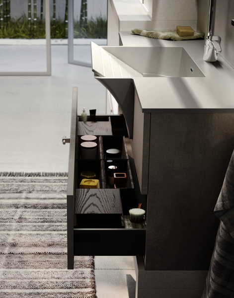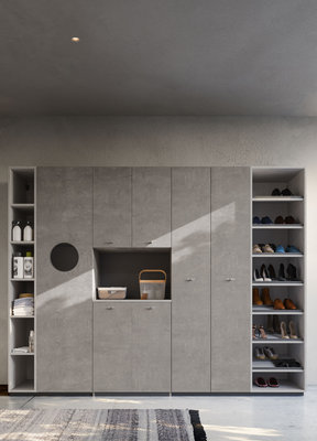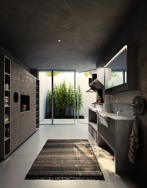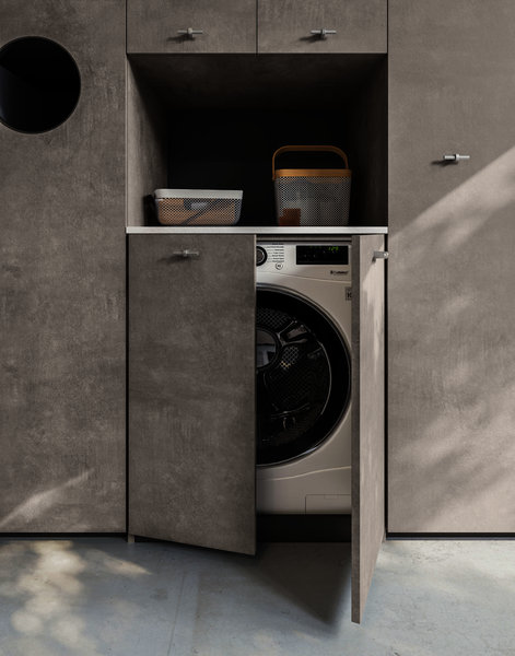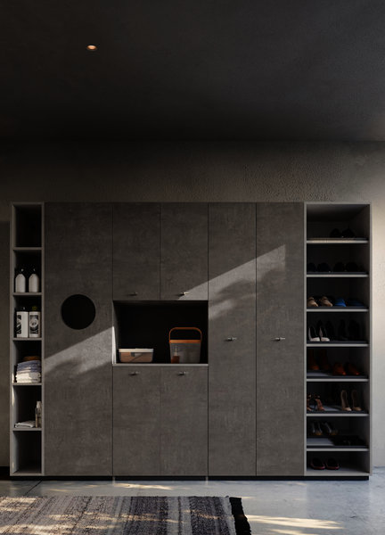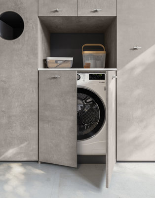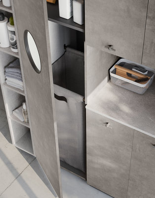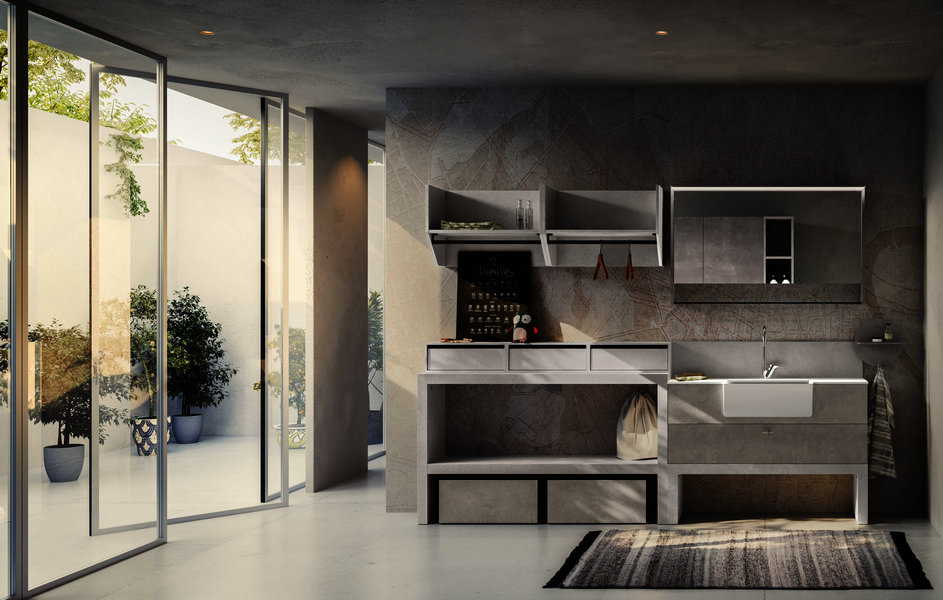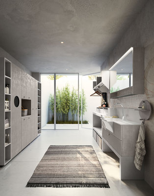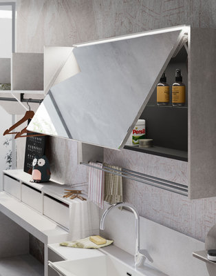 Base unit with open compartments and deep drawers in Strada and Calce laminate. Top with integrated wash tub and riser in matt White Stone Resin supplied with matching washboard. Basic mixer Chrome finish. Stendi storage Mirror with pull-up door, internal glass shelf, hangers in Nickel finish. The practical open wall units are equipped with a hanging bar. The equipped tall unit system allows a large housing space for the washing machine, or can alternatively be accessorized to store shoes, laundry, detergents and cleaning equipment. Fiberglass Plans wall covering