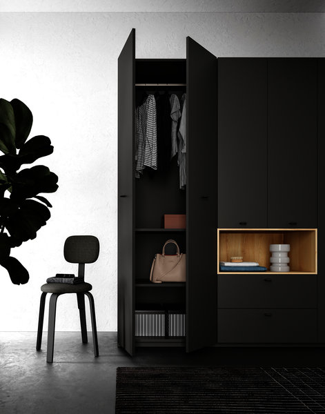 Floating base unit in Honey laminate with door and double drawers. Handle in steel finish. The unit is completed by the top with integrated sink in HPL Black & White Stone. The Nickel-finish metal leg supports the top and serves as a practical towel rack. Faucet is in matt Black. Brio glass and dispenser accessories. Vela original wedge-shaped mirror with integrated light. CartaBianca collection enables to create a practical closet, perfect for use as a wardrobe with doors and deep drawers to make best use of the space thanks to the broad range of sizes