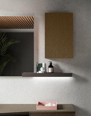 CartaBianca floating base unit with variable depth, perfect for long and narrow spaces. The Heat-Treated Oak veneered drawers are alternated with the Nickel-lacquered open connecting module. The top in Medea marble supports the Speen 3 sink in White Stone Resin. Similarly in Heat-Treated Oak is the wall unit with door completing the Recto mirror set with Recta attached LED lamp and stainless steel finish, and the metal shelf. The open full-height units also feature a metal structure and lend themselves to a range of functions. Fiberglass wallpaper applied to the floor as well