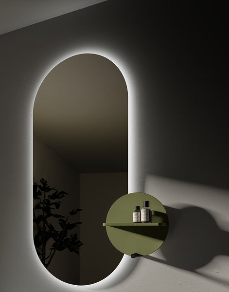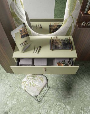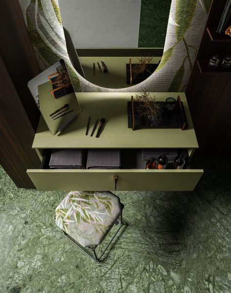 The Colonna freestanding washbasin with round base is finished with fiberglass in the Willowclay design. Floating side modules with Eucalyptus veneered doors, same as the top. Egg mirror vertically placed, lit up by the Clio lamp allowing adjustment and personalized orientation of the light source for spot or ambient lighting. The wallpaper echoes the washbasin covering and serves as a backdrop to the suspended deep drawer in a custom matt lacquer, handy as a vanity top, flanked by a full-height unit with doors and paneling with shelves similarly in a Eucalyptus veneer. The original shelf with a round base is customized in the same lacquer as the deep drawer.