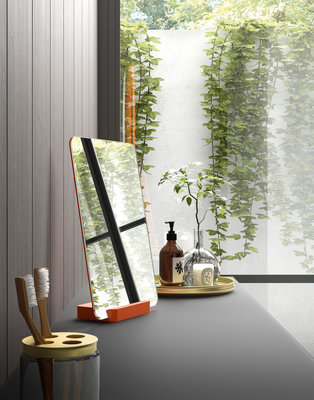 CartaBianca floating washbasin unit in Garden laminate with deep drawers and central insert in an open module, matt lacquered in Red Orange (RAL 2001). Push-pull opening. Top with integrated washbasin in Black acid-etched glass. The unit features a recessed side with small shelves matching the open module. Amy mixer in matt Black. Lacquered Moon mirror with perimeter LED lighting. Brio bench-top mirror accessory with matching resin base. All accessories in the Brio line can be customized with selected finishes and colors. Twins ceiling LED light in matt Black finish. Rectangular and square Stone occasional tables with nickel-finish metal frame and glass top available in different patterns.