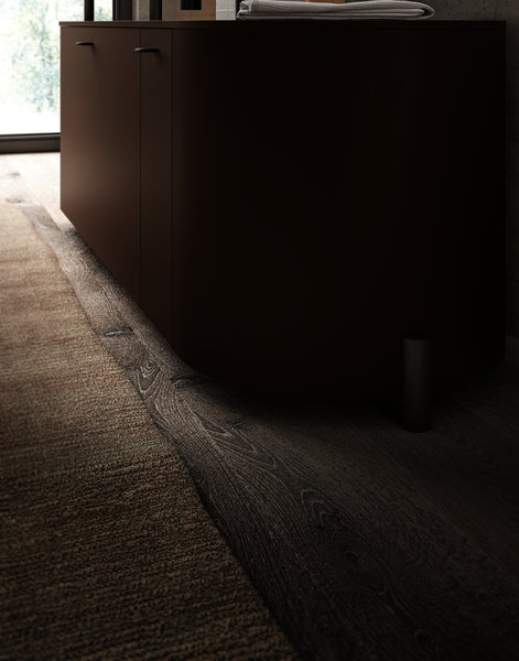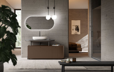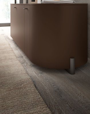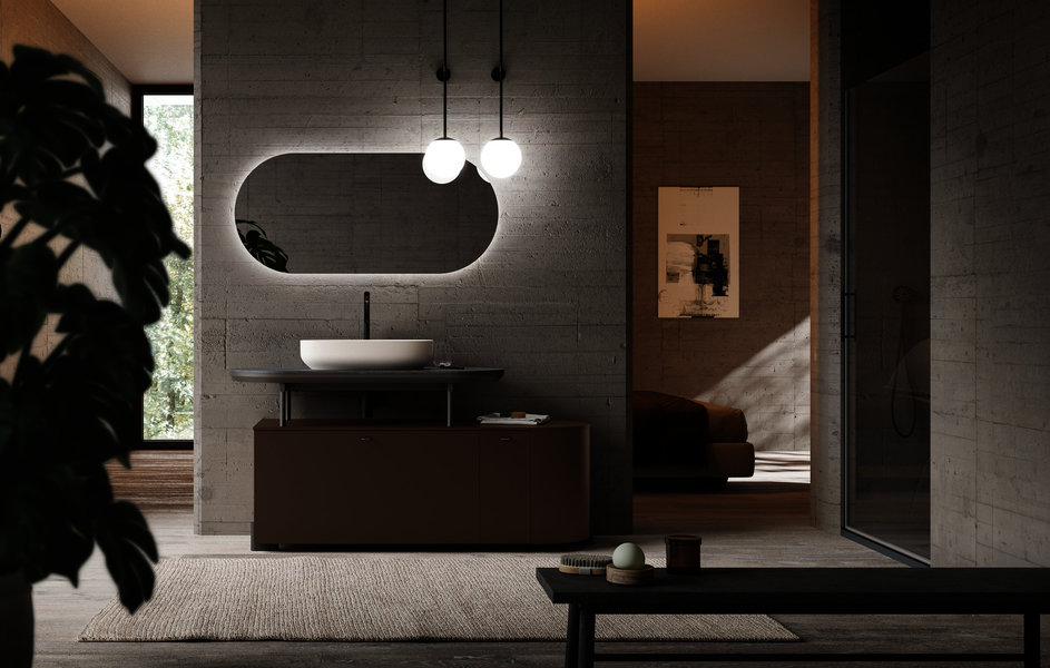 CartaBianca floor-standing base unit with curved right-hand end piece in matt lacquered Chocolate. The soft shape creates continuity with the silhouette of the top in Carbon laminate on a raised metal structure, paired with the Mirage black satin-finish mixer. Both the large backlit Egg mirror and the Speen 3 washbasin in white stone resin are inspired by soft oval forms. Double Daiki 1 wall lamp in white glass, gloss Black finish and details in Rose Gold