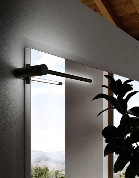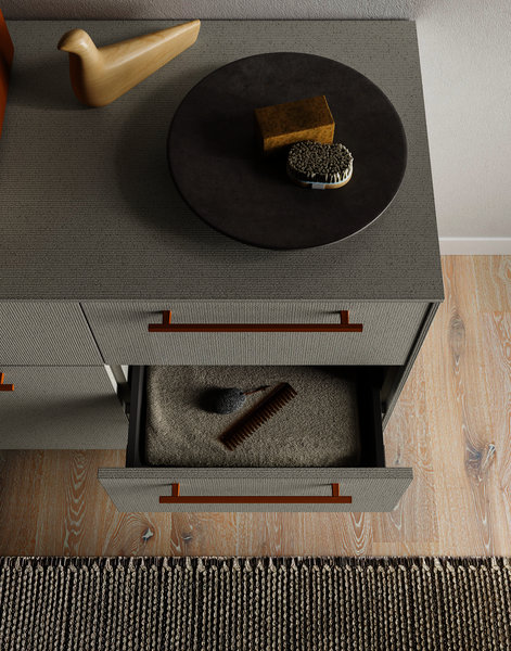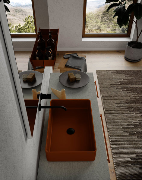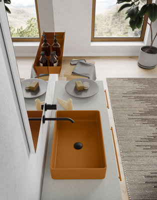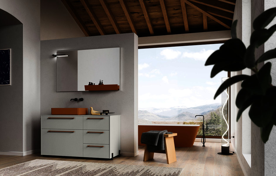 CartaBianca floor-standing base unit in Polaris laminate, just like the top on which the Anna L washbasin is mounted, externally lacquered in Ochre Brown (Ral 8001). The base unit sits on Nickel-finish feet that pair well with the tray accessory, just like the Amy wall-mounted faucet in matt black and the Tubetto LED light attached to the Recto mirror. Even the practical metal shelf applied to the mirror matches the washbasin finish. The coordination of the finishes is so flexible as to cover even the handles of the base unit deep drawers, but also the external lacquering of the Style freestanding bathtub in Tecnoril.
