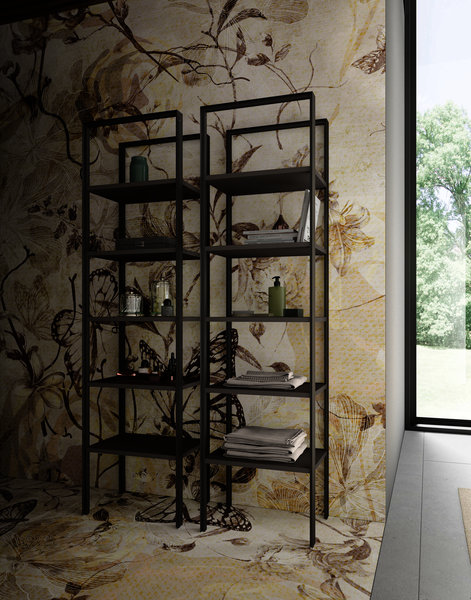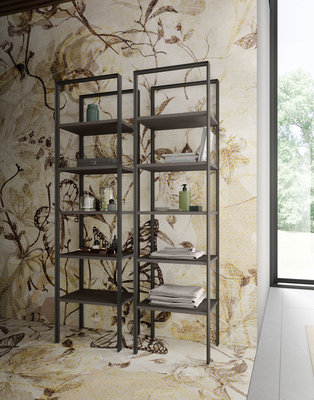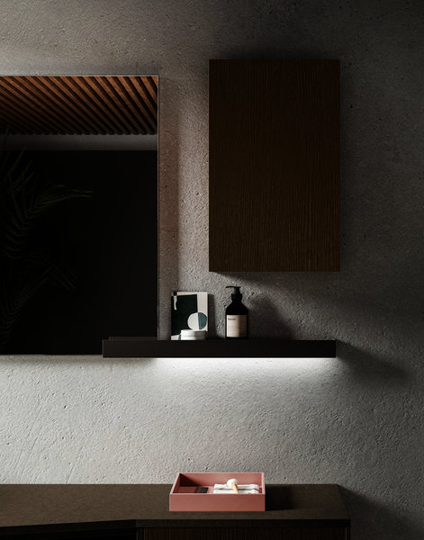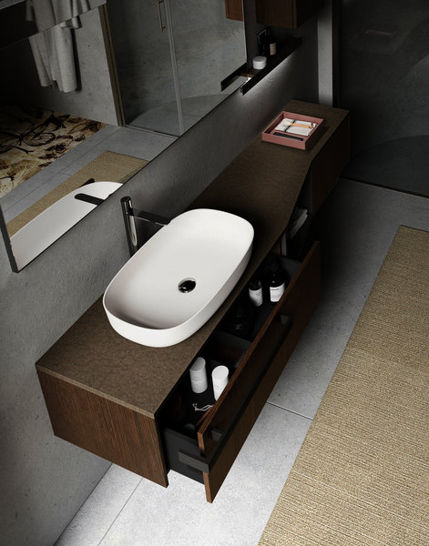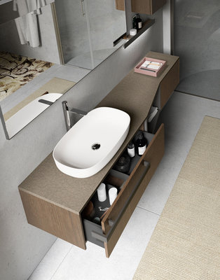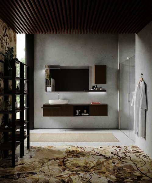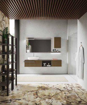 CartaBianca floating base unit with variable depth, perfect for long and narrow spaces. The Heat-Treated Oak veneered drawers are alternated with the Nickel-lacquered open connecting module. The top in Medea marble supports the Speen 3 sink in White Stone Resin. Similarly in Heat-Treated Oak is the wall unit with door completing the Recto mirror set with Recta attached LED lamp and stainless steel finish, and the metal shelf. The open full-height units also feature a metal structure and lend themselves to a range of functions. Fiberglass wallpaper applied to the floor as well