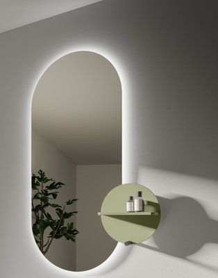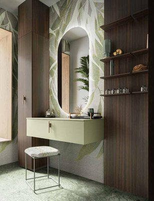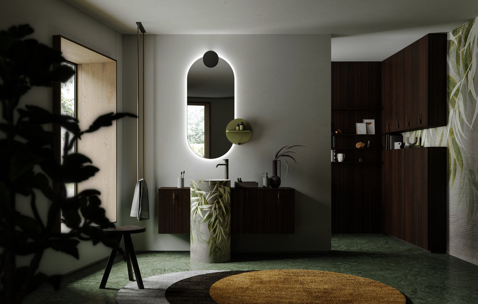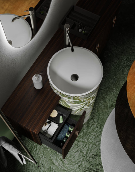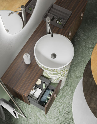 The Colonna freestanding washbasin with round base is finished with fiberglass in the Willowclay design. Floating side modules with Eucalyptus veneered doors, same as the top. Egg mirror vertically placed, lit up by the Clio lamp allowing adjustment and personalized orientation of the light source for spot or ambient lighting. The wallpaper echoes the washbasin covering and serves as a backdrop to the suspended deep drawer in a custom matt lacquer, handy as a vanity top, flanked by a full-height unit with doors and paneling with shelves similarly in a Eucalyptus veneer. The original shelf with a round base is customized in the same lacquer as the deep drawer.