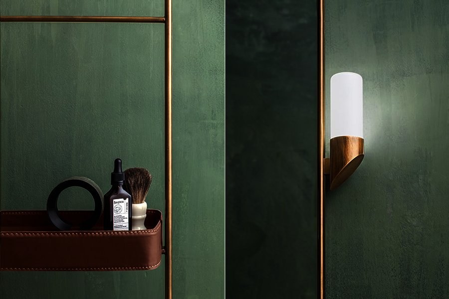 Soft shapes for the conical washbasin unit in Canaletto Walnut and Evam basin in Talco finish Ecomalta® with integrated basin. Details, mirror, lamp and accessories in bronzed metal. Self-supporting serving table with Ecomalta® base unit - available in several color finishes - and leather accessories, such as bags, boxes and mirrors, but also convenient multi-purpose hooks. Glossy Antique Bronze finish also for the table with hand-stitched leather tray