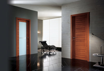<p>Modern style interior door in solid wood that features horizontal dark & light wooden grains, large glass, magnetic lock, completely concealed hinges, opens 180 degrees, trims on room side are flush with the door.</p>
